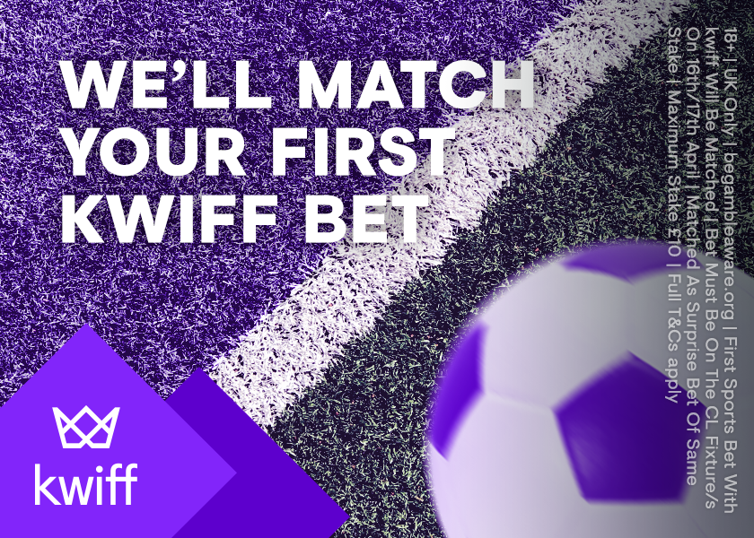 – When you place your first bet with kwiff (on the Champions League) during the promotional period, we’ll match the stake of that bet up to £10 with a surprise bet that will be credited by 5pm on Thursday 18th April.